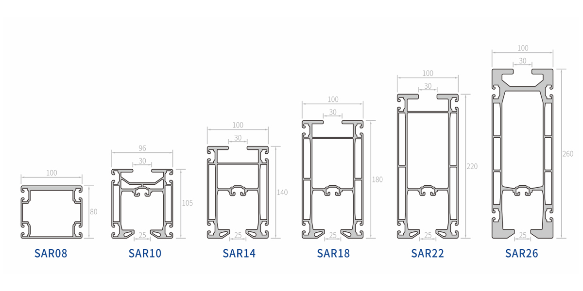 | SAR08 | Aluminio, anodizado | 4,1 kg/m2 | 152cm^4/202cm^4 | 30cm^3/40cm^3 |