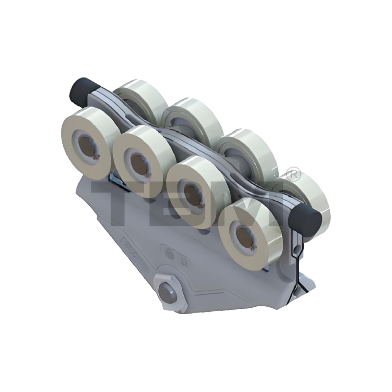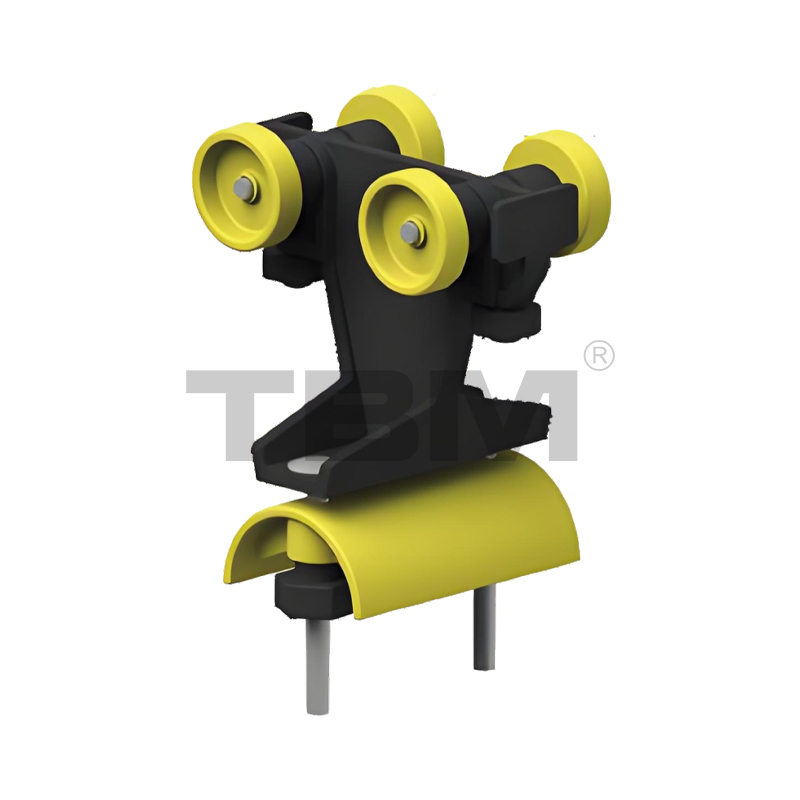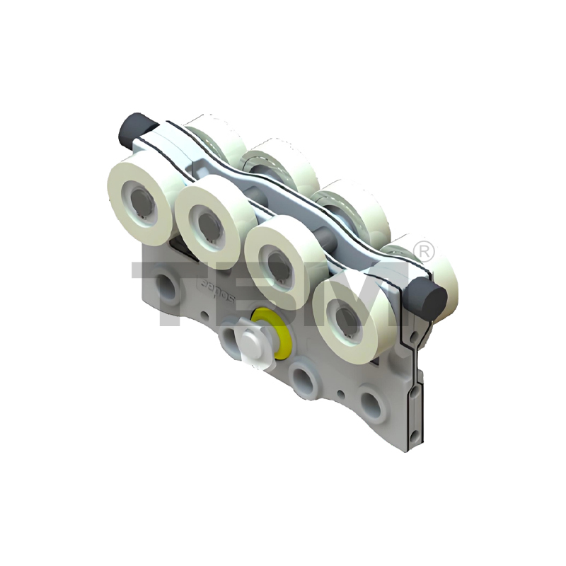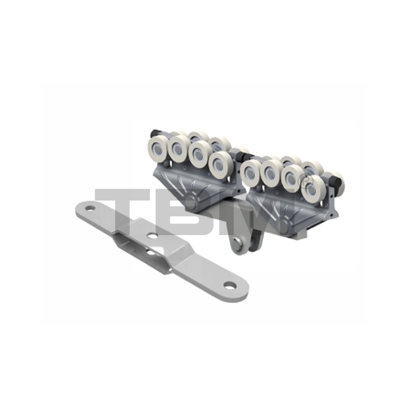 ■ El carro está fundido/forjado con nailon de alta resistencia y resistente al desgaste para un deslizamiento suave y un funcionamiento sencillo. Two rows of upper and lower rollers provide pry-resistant and anti-bias protection.