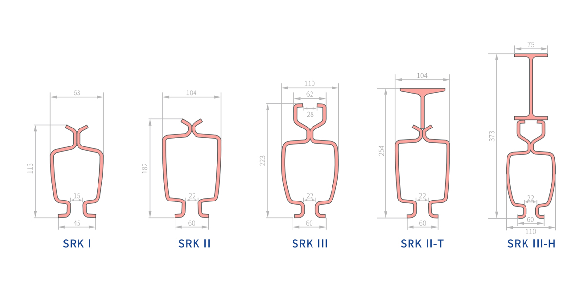 | SRK Ⅲ-H | Acero dulce de alta resistencia | 38,6 kg/m | 49,12 cm² | 5900cm⁴ | No equipado con rieles fijos | El siguiente gráfico | Tamaño personalizado | RAL2002 |